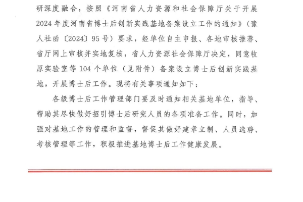 10月8日,河南省人力资源和社会保障厅印发《关于同意牧原实验室等104个单位备案设立博士后创新实践基地的通知》,洛阳黄瓜视频下载探伤技术有限公司获批设立河南省博士后创新实践基地,标志着我司科研创新和高层次人才队伍建设工作迈上新台阶。