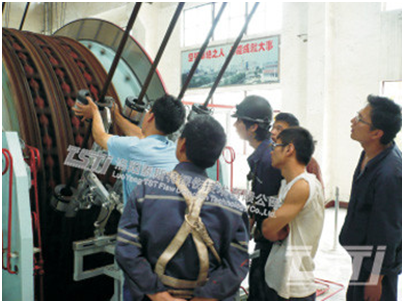 2、维护方便:位于绞车房摩擦轮下出绳处,操作空间大,易于对检测系统进行定期检查维护。安装后系统坚固耐用、长期免维护。前探伤装置结构采用可移动平台形式,需要检测时将移动平台沿轨道推到检测位置,不需要检测时将移动平台移置边,不影响换绳或维护摩擦轮工作的进行;
